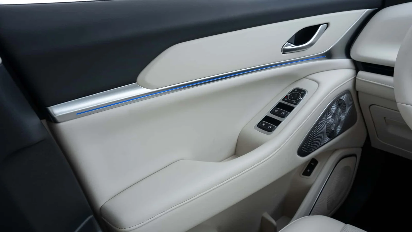 A terceira fileira usa layout de teatro com altura elevada em relação à segunda. O acabamento é em couro Nappa nas opções Marfim ou Preto. O modelo tem iluminação ambiente inteligente e teto solar elétrico panorâmico.