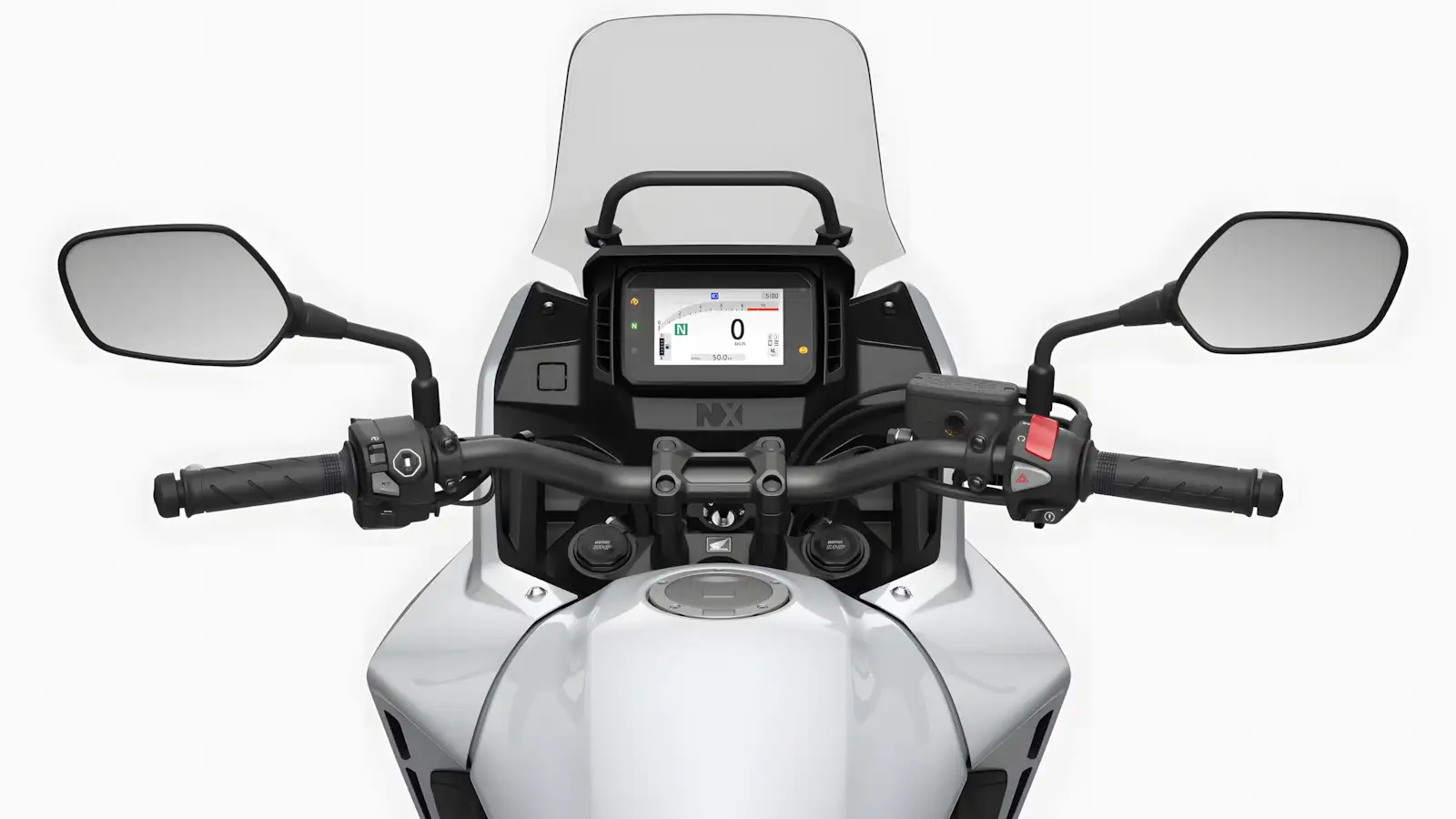 A NX 500 agora adota painel TFT colorido de 5 polegadas, com boa visibilidade mesmo sob iluminação forte, múltiplos layouts e até conexão com smartphone via RoadSync.