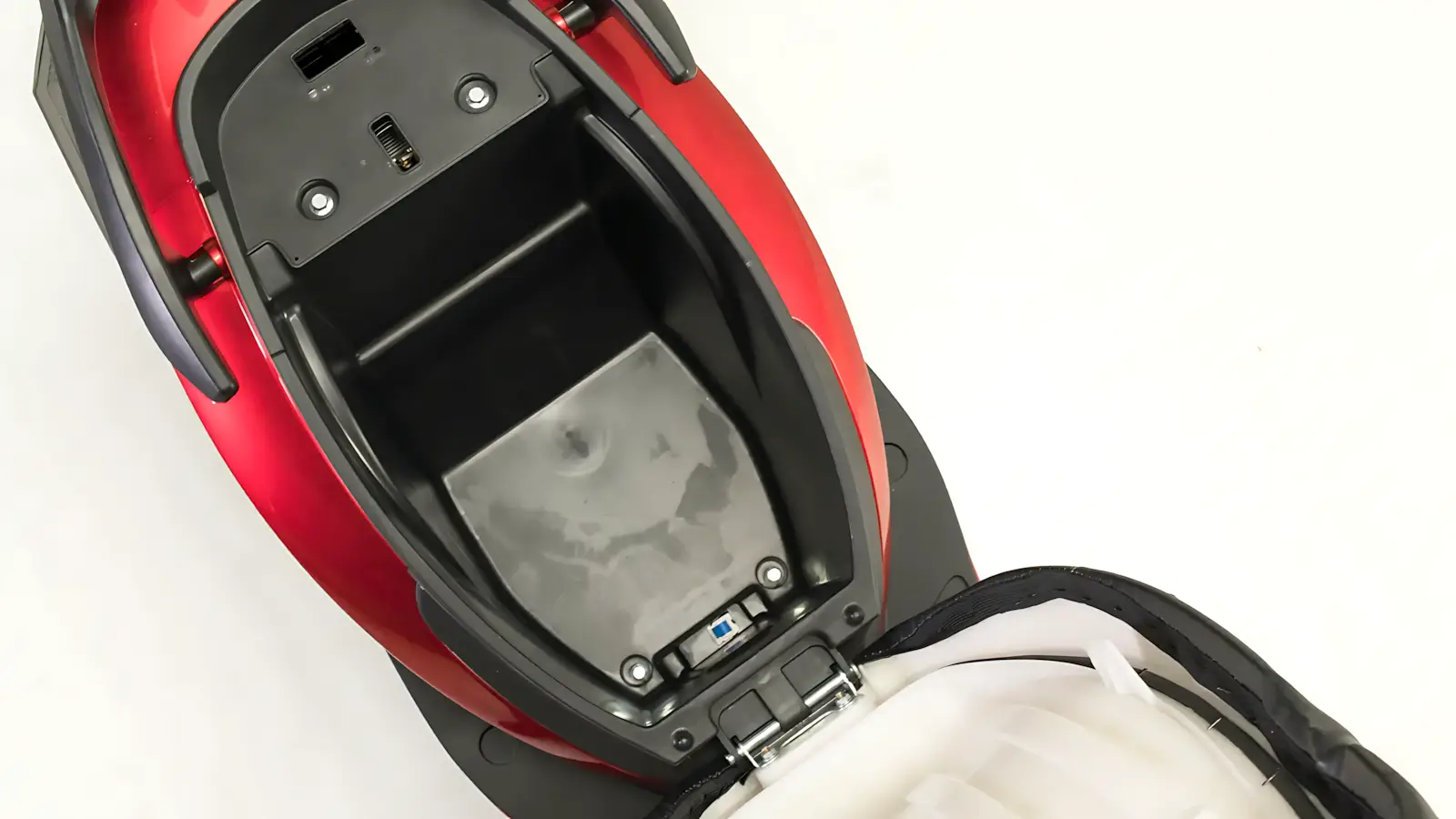 O modelo está disponível nas cores preto, roxo, vermelho e branco, oferecendo opções para diferentes perfis de consumidor. O banco traz um pequeno compartimento sob o assento para objetos do dia a dia, o que é útil para o transporte de itens leves.