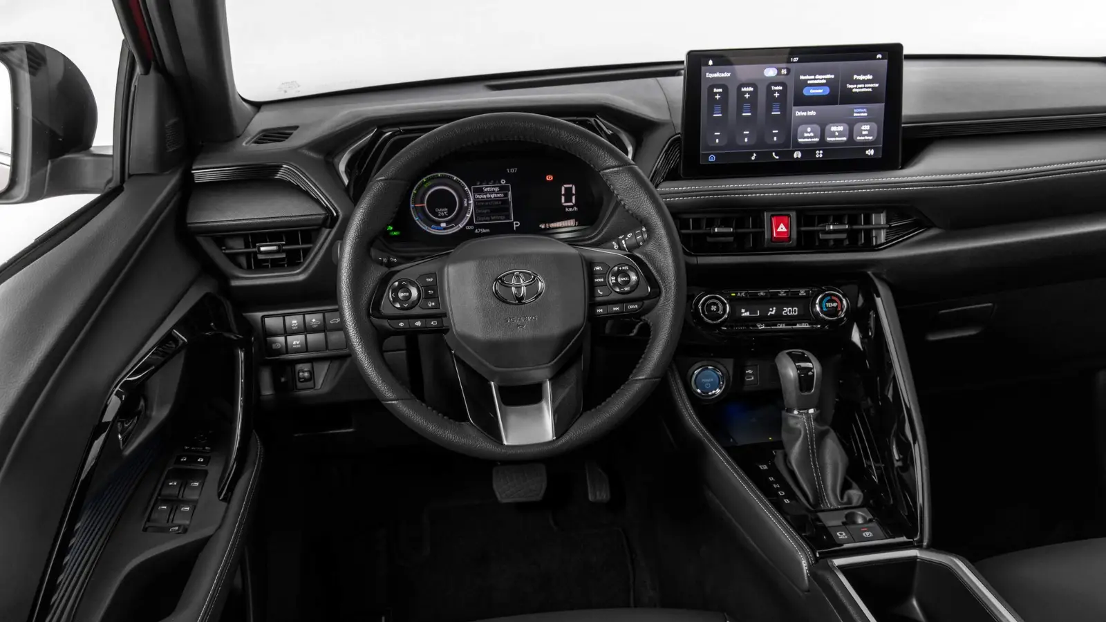 O pacote Toyota Safety Sense (TSS) vem completo em toda a linha. Isso significa que até a versão mais básica conta com controle de cruzeiro adaptativo, alerta de permanência em faixa, frenagem autônoma de emergência e farol alto automático. Recursos que antes eram exclusivos de modelos premium agora aparecem como item de série.